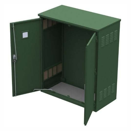 The cabinet features two plain front doors, providing a clean and unobstructed front profile for secure access and clear visibility through the meter window. Ventilation is achieved through side-mounted louvres, allowing effective natural convection airflow while maintaining the integrity and simplicity of the front door design.