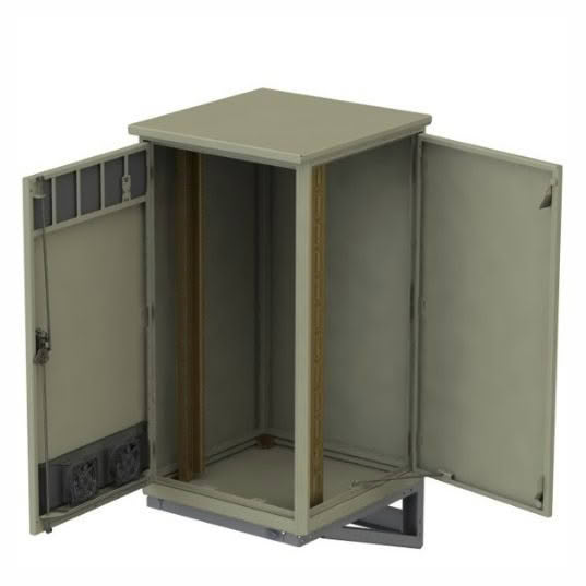 This cabinet features a double-bay, four-door configuration with overlapping front and back doors to improve sealing and protection. It is supplied with two pairs of 19″ mounting rails at 28 RU and two pairs of 19″ mounting rails at 6 RU, offering flexible mounting options for a wide range of equipment.