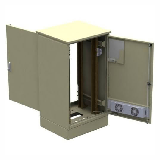 Features two pairs of 19″ EIA mounting rails, three-point locking with swing-handle padlocks, naturally vented louvres with filter foam at the base of the front door (optional fan kits available), document holder, and plain rear door. Mounting is available on an optional 150 mm aluminium plinth.